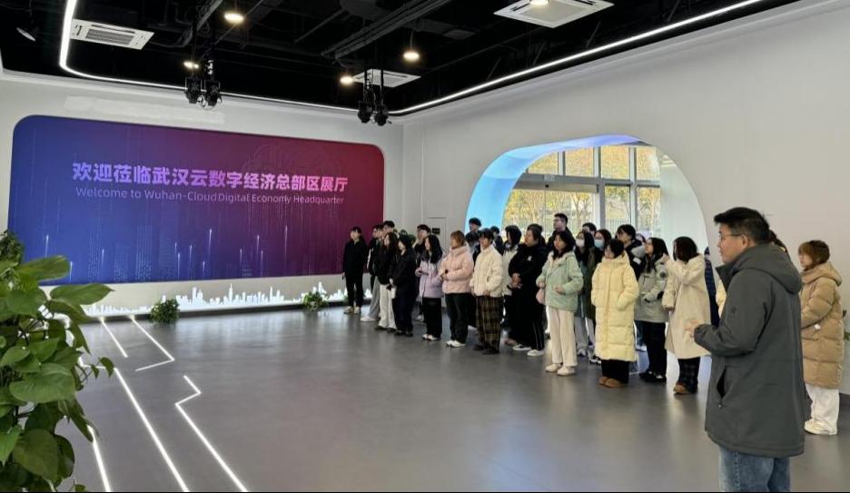 为加深同学们对人工智能与大数据在实际产业应用中的认知和理解,近距离感受数字经济的蓬勃发展态势,拓宽专业视野,2024年12月13日,管理学院信管专业2023大数据实验班的全体同学在杨单老师的带领下赴武汉云数字经济总部参观学习。