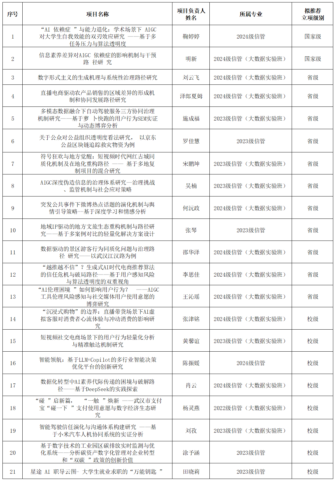 (文字:张含森)近日,2025年必赢国际437官网大学生创新创业训练计划项目拟立项名单公示,国家级一流专业建设点——信息管理与信息系统(以下简称“信管”)专业表现亮眼,总计立项21项,创历史新高,其中大数据实验班立项15项。