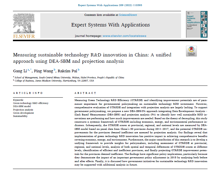 管理学院李刚老师作为第一作者和通讯作者与美国James Madison UniversityPing WangRaktim Pal两位老师合作的论文“Measuring sustainable technology R&D innovation in China: A unified approach using DEA-SBM and projection analysis”在期刊《Expert Systems with Applications》发表(2022年第209卷)。该期刊系运筹学与管理科学领域的TOP期刊,2021年的影响因子/中科院升级版分区分别为8.665/SCI一区。