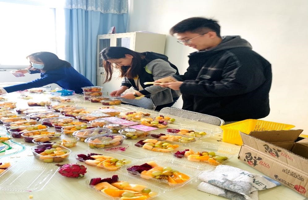 当天上午,志愿者同学们把采购来的水果进行切洗,分装,每一份水果附上了同学手写的考研鼓励贺卡。经过一上午的精心准备,完成了共计60份的水果拼盘,有橙子、枣子、火龙果、葡萄等水果。寓意着考研“橙”功、“枣”日上岸,“葡”匐前行。