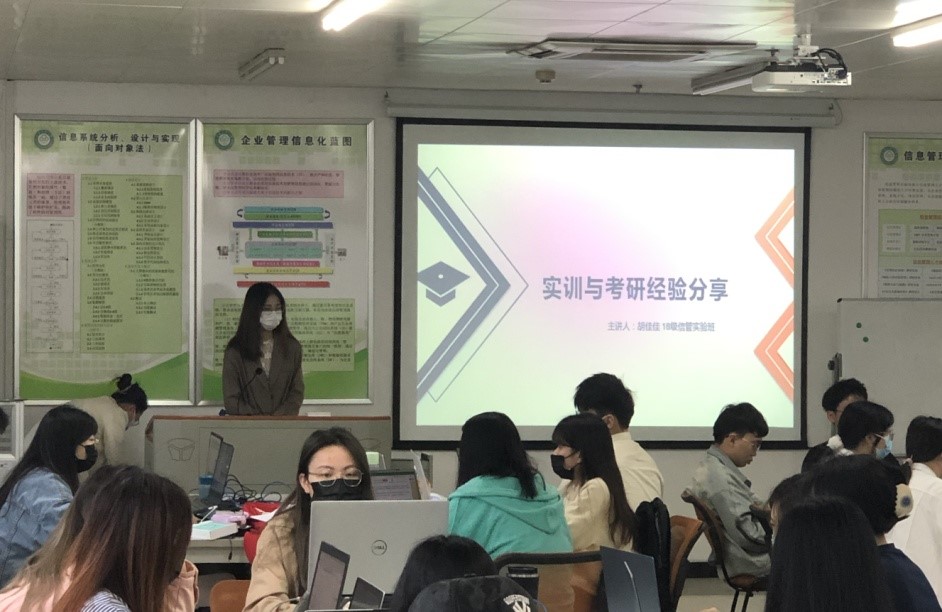 会上还请到了18级信管实验班的两位学姐与学弟学妹们交流她们的实训心得。