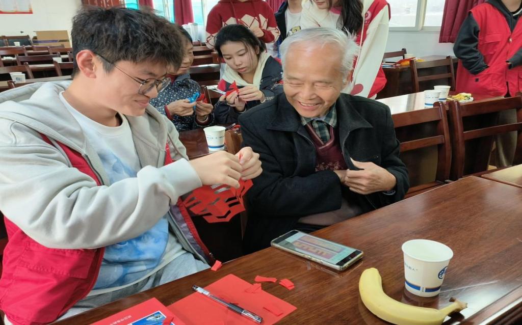“趣味剪纸”环节,志愿者带领老人们用剪纸艺术探索生活的乐趣,以剪纸传递温暖,共同体验剪纸艺术的独特魅力。一把剪刀、 一张红纸,纸张一翻一折,指尖带着剪刀灵活“走位”,乾坤惊现:形态各异、大小不一的“囍”字、“春”字、“寿”字,活灵活现地跳跃在了老人们的手上,老人们非常高兴地向社区工作人员展示自己的作品。