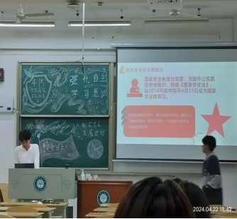 各班级通过知识问答、图文讲解等多种形式开展线下主题团会,展现出新时代大学生的精神风貌。国家安全教育组从“全民国家安全教育日”的设立背景、现实意义等方面进行详细地讲解,引导学生更加深刻地认识国家安全的重要性,增强对国家的认同感和归属感;强化学生自主学习意识专题组致力于培养学生的独立思考能力,引导学生自主分析问题、解决问题,提高学生的创造性和独立性;爱国主义教育组,通过重温红色历史深入推广国家的文化和传统,把握爱国主义教育特点,着力培养管院学子的爱国主义意识,推动爱国主义教育深入、有效开展。