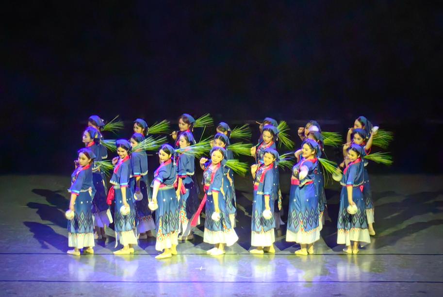 同学们身着华美的民族服饰,光彩夺目,宛如夜空中最亮的星星,神秘的方言充斥着整个大礼堂,枯黄的庄稼生长在麦田中,“娘母”敲打着公鸡碗向上天祈福,愿来年庄稼丰收,麦田郁郁葱葱,她们奋力挥舞着手臂,预示着生命的不息与传递。