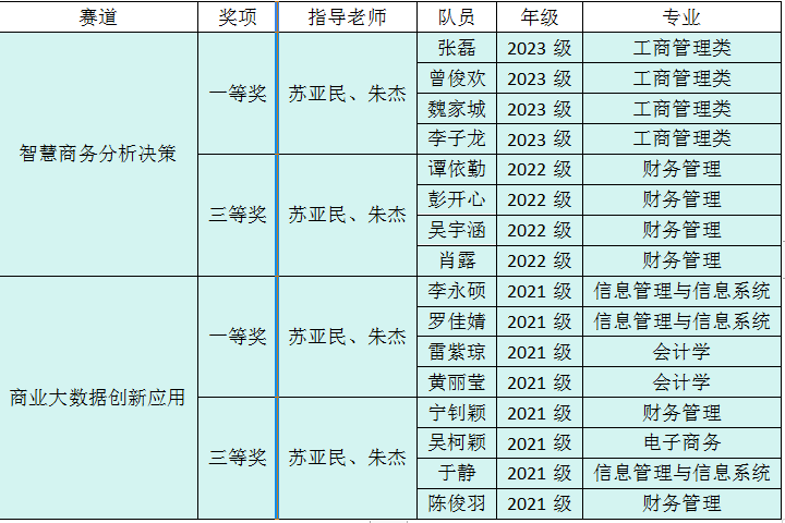 2024年6月,由中国商业经济学会主办,武汉大学经济与管理学院承办,武汉育知联信息科技有限公司、小育科技(湖北)有限公司提供技术支持的第五届全国大学生智慧商务大数据创新应用大赛全国总决赛落下帷幕,我院学子在苏亚民、朱杰老师指导下夺得两项一等奖和两项三等奖佳绩。该赛事流程为校内选拔赛、区域选拔赛、全国总决赛,分为“智慧商务分析决策”赛道和“商业大数据创新应用”赛道,旨在适应数字经济产业人才需求的新变化,推进高校经济与管理类专业教学改革与转型升级,激发大学生对智慧商务大数据分析决策、大数据技术创新应用的兴趣和创新能力,进而推动管理学科的发展和人才培养。