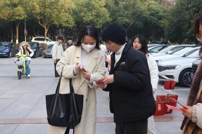 当日中午,工作人员和志愿者们在5栋广场集合,有条不紊地分装礼包,布置活动现场。下午3点半活动开始,为确保现场井然有序,志愿者们分列引导考研学生依编号领取礼包。礼包含学校食堂“上岸”套餐餐券2张、橙子2个、1瓶水以及盖有“折桂”“上岸”“逢考必过”“管理学院”等篆书印章的书签1枚。1瓶水代表“第一名”,2个橙子寓意“考研能成、心想事成”,组合成的数字“100”寓意“考满分”,多枚印章由学院党委副书记李明亮精心雕刻,“上岸”套餐餐券还单独印上了学生的名字及祝福语,寓意学院时刻为考研学子护航。“所有寓意,皆愿考研的学长学姐们在考研之路上一帆风顺!”学院团委学生负责人刘翊昭然介绍道。