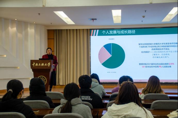 田尧依据自身赴港求学的经历与感悟,站在“民大人”的立场上,围绕个人发展轨迹、留学成本效益以及毕业后的就业形势等维度,与在场同学探讨了留学的价值与筹备策略。她表示,留学不仅能有效缩减学业时长,还能提升个人综合素养、开阔国际视野、促进跨文化交流、强化外语应用能力、丰富个人履历,为未来的职业发展和学业深造构筑坚实基础,增添竞争优势。与此同时,田尧也为在座同学提供了切实可行的建议。她强调,有意留学的同学应重视日常课程成绩的积累,在外语学习上投入充足精力,紧密留意学校相关部门发布的各类信息,提前做好周全规划和充分准备,从而提升留学申请的成功率。