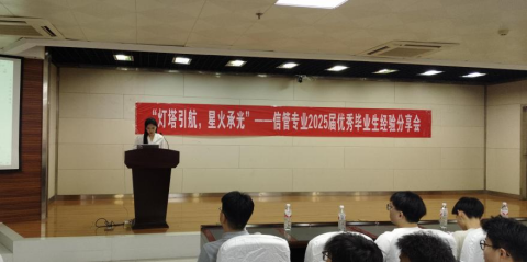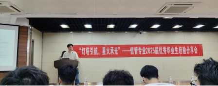 为助力学子锚定人生航向,5月23日晚,学院信息管理与信息系统专业于16栋教学楼2楼报告厅举办主题为“灯塔引航,星火承光”的2025届优秀毕业生经验分享会。活动特邀本专业10名保研、考研、考公、就业、留学等领域优秀毕业生和1位优秀校友担任主讲。学院近200名学生到场聆听,信息管理与信息系统系主任杨单、杜文华等出席活动。
