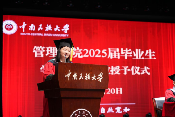 本科生毕业生代表王一然表达了对母校的深情厚谊和对未来的美好憧憬。她号召大家在人生的赛道上继续用管理学科的系统思维去洞察世界,以科学的分析方法去解决问题,利用所学知识,投身乡村振兴、创新创业等社会实践,让管理智慧在基层生根发芽。
