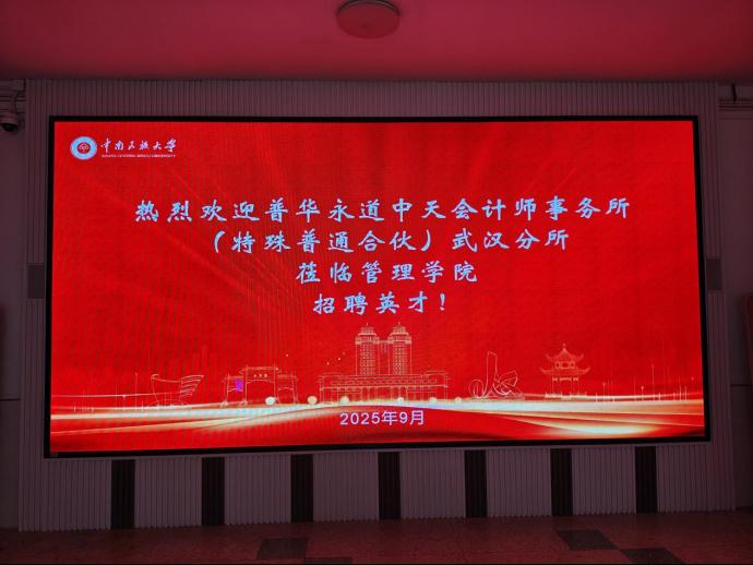 南湖秋水育栋梁,职场东风送良机。9月23日下午,普华永道中天会计师事务所(特殊普通合伙)武汉分所应邀在我院举办专场校园宣讲会。宣讲会由该所审计部经理林靖钦主持,我院优秀校友、现任职于该所的唐蛟、张智林返校分享。本次活动由我院会计系教师刘华统筹协助,为管院学子带来了一场内容翔实的职业发展指导课。