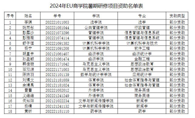 关于对2024年EU商学院暑期研修项目资助名单的公示