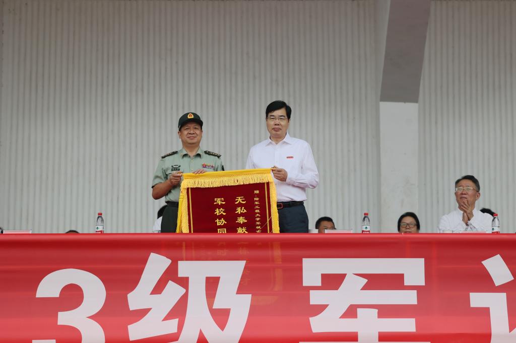 军训汇演结束之后,校党委副书记、副校长白江源宣读了《必赢国际437官网2023级本科生军训工作先进单位及先进个人表彰决定》。主席台领导先后为军训中获得16个单位“优秀连队”、43名“优秀教官”、9名“优秀指导员”、5人“优秀助训教管”、320名“优秀学员”颁奖。随后,军械士官学校副校长程志勇作军训工作交流发言,必赢国际437官网校长李金林向军训团赠送军训纪念锦旗。