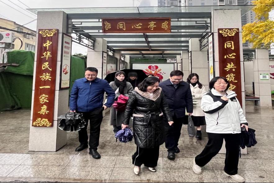 他们步行穿过远近闻名的广益桥牛羊肉市场,冒雨前往学院与民权街共建的同心亭长廊参观。“中华民族一家亲,同心共筑中国梦”的对联映入眼帘,两旁张贴着铸牢中华民族共同体意识宣传海报,旁边一棵石榴树枝繁叶茂,象征着民族团结与和谐。大家边走边看,边听讲解员讲述,一个个生动的社区民族团结故事激荡心潮。