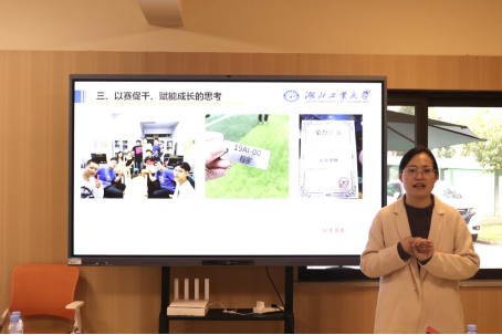 程宇以《以赛促干,赋能成长》为题,阐述了参与辅导员素质能力大赛对个人成长的促进作用,特别强调谈心谈话环节的价值引领作用,实现了从理论到实践的深度转化。她认为,“以赛促学,赋能成长”的理念是在比赛中学习新知、优化工作方法,从而更好地服务学生、推动学生的全面发展的关键。