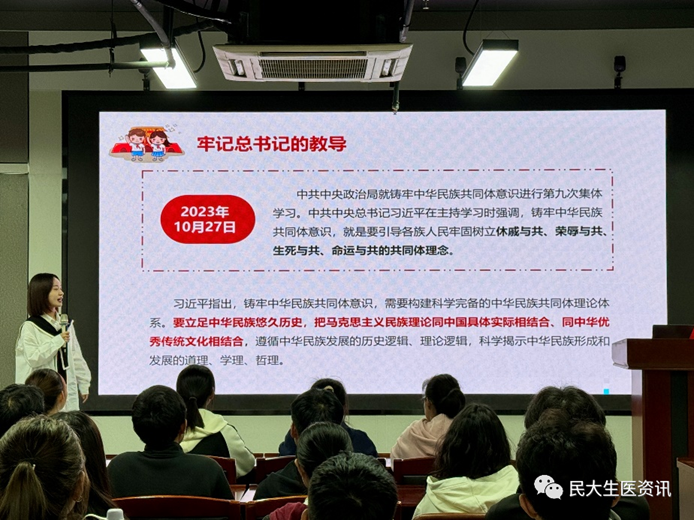 在集中观看了习近平总书记在中共中央政治局第九次集体学习时的重要讲话精神专题学习视频后,叶颖向入党积极分子讲解了习近平总书记关于铸牢中华民族共同体意识重要讲话的精神内涵和重要意义,从党史中的民族团结小故事出发,介绍了自中国共产党成立以来,我们党在民族团结与平等、发展民族地区经济、改善民族地区教育文化等方面出台的方针政策,强调了在新征程上我们党的民族工作面临的新的形势和任务。同时,结合习近平总书记提出的“铸牢中华民族共同体意识,要立足中华民族悠久历史,把马克思主义民族理论同中国具体实际相结合、同中华优秀传统文化相结合”的重要论断,叶颖阐述了中华民族自古以来包容、自信、开放的文化特征,指出了“民族的”才是“世界的”中华优秀传统文化,鼓励同学们要开拓眼界,深刻理解中华民族发展的历史逻辑、理论逻辑,树立远大目标,勤奋学习,脚踏实地,为强国建设、民族复兴凝聚青春力量。
