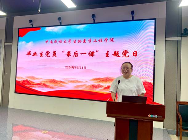 (文/薛宇,图/叶颖)为进一步加强毕业生党员学习教育,激发毕业生党员爱校荣校情怀,营造温馨有序的离校氛围,6月11日下午,生物医学工程学院组织全体毕业生党员(含本科生和研究生)开展“最后一课”主题党日活动。学院党委书记贺铭出席,全体毕业生党员参加,主题党日由学工办副主任叶颖主持。