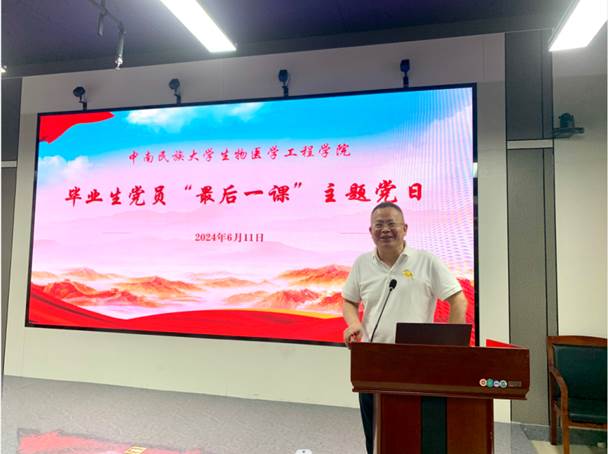 贺铭为全体毕业生党员讲授“最后一课”。他向全体党员提出了希望和要求:一是为人要正派,品德要高尚,心中有正义;二是专业要精进,敢于挑重担,为家国随时奉献。他告诫大家要将“理论武装头脑”落到实处,坚持学习党的知识,深刻领悟其中内涵,在学思践悟中坚定理想信念,在奋发有为中践行初心使命。他强调,作为生医学院的一员要深刻剖析“笃信好学,自然宽和”的校训和“医工融合,志惠民生”的院训精神,围绕铸牢中华民族共同体意识主线要求,用所学专业积极投身国家人民健康事业,心怀家国,不忘母校母院培养之恩。