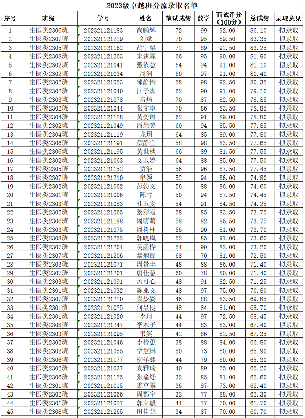 根据学校《关于做好2024年本科学生大类专业分流工作的通知》和学院《智能医学工程卓越工程师班2024年本科学生选拔工作方案》文件精神,现将2023级专业分流智能医学工程卓越工程师班拟录取名单公示如下: