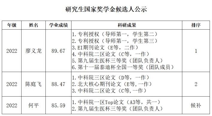 根据《必赢国际437官网研究生国家奖学金评审实施办法(修订)》(民大发〔2018〕21号)和《生物医学工程学院研究生国家奖学金评审实施细则》及相关文件精神,经研究生个人申报,学院研究生国家奖学金评审小组综合评议,并报学院党委会审议通过,确定2024年生物医学工程学院研究生国家奖学金候选人名单,现公示如下: