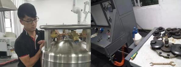 图为检测单位工作人员拆卸、安装仪器设备安全阀
