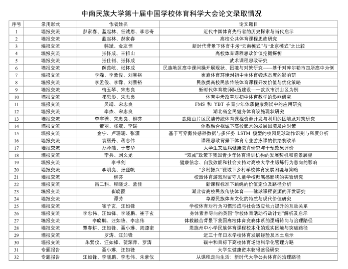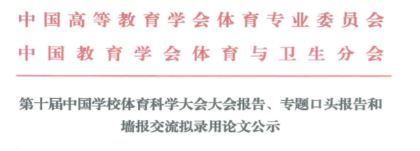 (作者:熊雅丽)12月30日,第十届中国学校体育科学大会录用名单正式发布,我院师生共计录用32篇论文,其中专题汇报2篇,墙报交流30篇,录取篇数位列全国民族院校第1位,湖北省高校第2位。我院师生在此次大会中再创佳绩,表明近年来我院学科培养质量稳步提升,师生科研创新能力不断增强,也进一步提升了必赢官网在全国高校中的影响力和知名度。