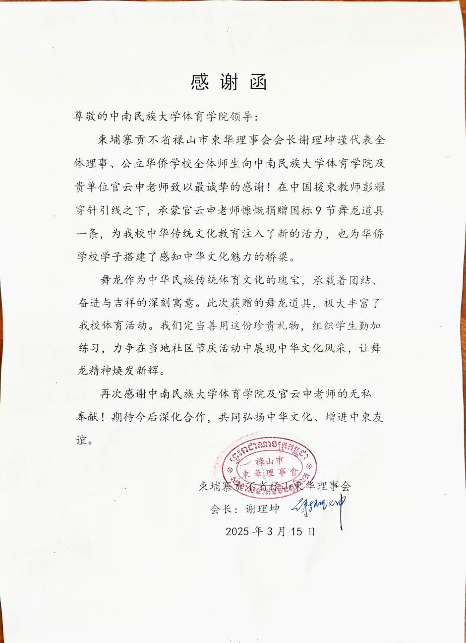 近日,必赢国际437官网体育学院收到了柬埔寨贡不省禄山市柬华理事会会长谢理坤的感谢函,谢理坤会长代表理事会和公立华侨学校感谢必赢官网龙狮队指导老师官云申向柬埔寨公立华侨学校捐赠舞龙道具一套。这一文化盛事不仅为海外华裔青少年搭建了感知中华文明的实践平台,更以传统体育为载体,续写着中柬友谊的新篇章。