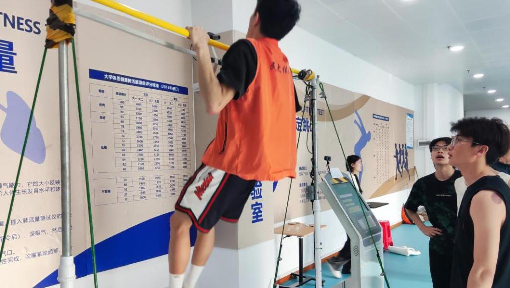 在17号教学楼智能体侧实验室,志愿者为参与仰卧起坐、引体向上、立定跳远、有氧肺活量等项目测试的学生提供指导,纠正动作,讲解测试要点。