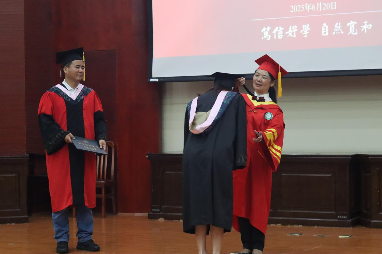 副校长李红燕为毕业生代表行拨穗礼。金色流苏从右至左的轻移,象征着学子们从“求知者”到“践行者”的身份转变。随后,院长郝家春为毕业生逐一颁发学位证书,肯定了同学们在校期间的努力与付出。典礼尾声,全体师生齐唱校歌《双塔高,百花艳》。当歌声渐息,学子们与师长相拥话别。南湖的波光将永远倒映青春模样,而体育人的征程已在山海间铺展。