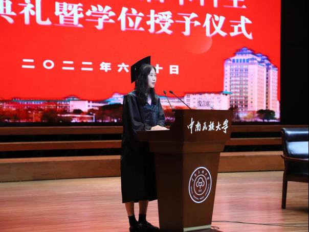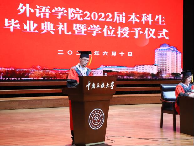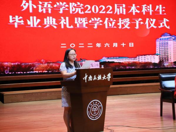 怀揣梦想和希望,携带嘱托和祝福。我院教师代表陈丹深情回顾了学子们在四年的成长。同学们在这里学习知识、历练心智、增长才干,收获成长,用勤奋和智慧诠释责任和担当。致辞中,她谈到:“诸位学子四年前来到这秀丽的南湖之滨找到了自己的信仰,学习了专业知识,结实了一群志同道合的伙伴。在学习之余,参加各类社团活动,为第九届军运会的外国友人提供翻译服务......这些构成了你们多姿多彩的大学生活,亦见证了你们的成长。而未来无论你们走到哪里,民大外院永远是你们温馨的港湾。”