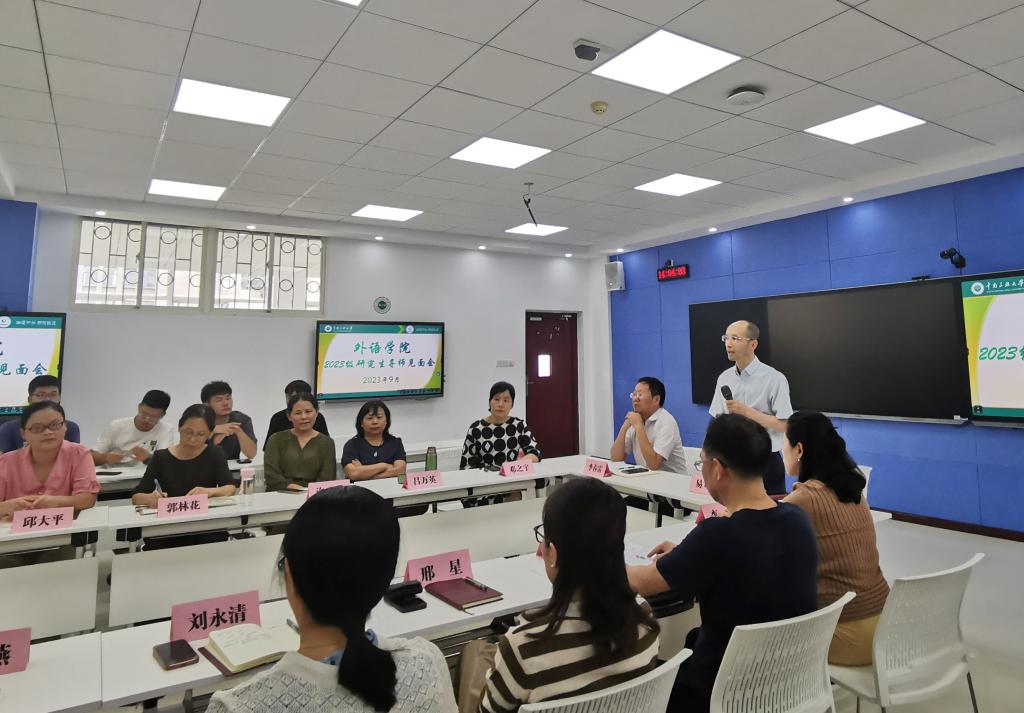 易立新院长代表学院向2023级全体研究生新生表示热烈欢迎并致辞,对出席见面会的导师作了简要介绍;李明副院长介绍了外语学院研究生学位点的发展历程,教学科研成果与师资力量等;学位点负责人翁义明老师和邢星老师分别介绍了外国语言文学学位点和翻译硕士学位点的基本情况、学科特色与培养要求等。在互动提问环节,同学们进一步咨询了专业实习实践、研究生出国交换项目、学术论文发表等问题。