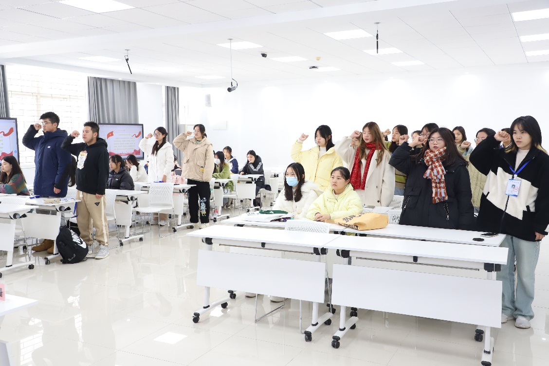 学生发言结束后,方明胜与陈骊姗为新学生记者颁发了记者证,副团长陈欣蕾带领新记者进行了庄严的宣誓。