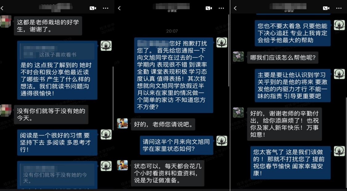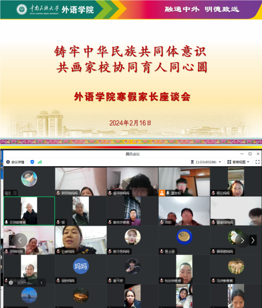 云端家访,育梦起航。学院各年级也通过线上平台多渠道搭建起家校沟通桥梁,落实“云家访”全覆盖。辅导员、班导师开展线上一对一视频家访,与家长进行深入交流,传递学校对学生培养的重视和关爱,认真了解家长期许,帮助学生家长了解学生在校情况;特别组织召开“铸牢中华民族共同体意识 共画家校协同育人同心圆”主题线上家长座谈会,详细介绍学院过去一年所开展的学生工作和取得的突出成绩,为家长答疑解惑,筑牢家校协同育人平台;以短信方式发送“寒假致家长的一封信”、在家长群发送“外语学院2024年学生工作回顾”以及“春节致家长的一封信”,落实育人责任,提升育人温度,拉近家校距离。