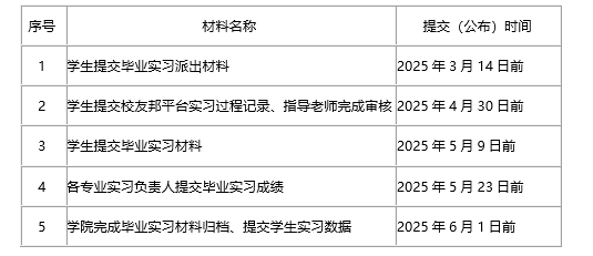 参加集中实习的学生于2025年2月28日前完成报名,报名方式详见学院集中实习招募通知;并于2025年3月14日前按照集中实习各基地带队老师要求,完成集中实习派出工作。