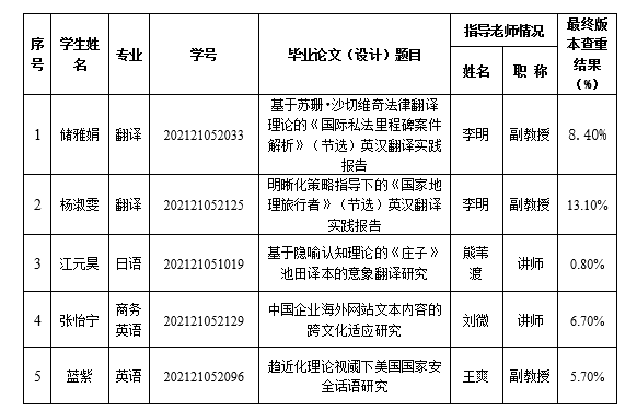 根据学校《关于做好2025届本科生校级优秀毕业论文(设计)评选工作的通知》《必赢国际437官网本科学生毕业论文(设计)管理办法》相关规定和《外语学院本科生校级优秀毕业论文(设计)评选实施办法》,我院按照公平、公正、公开的原则,对各专业推荐的优秀论文“知网”查重检测结果进行审核,组织答辩和专家匿名外审,最终评选出5篇校级优秀毕业论文,现将2025届本科生校级优秀毕业论文拟推荐名单公示如下: