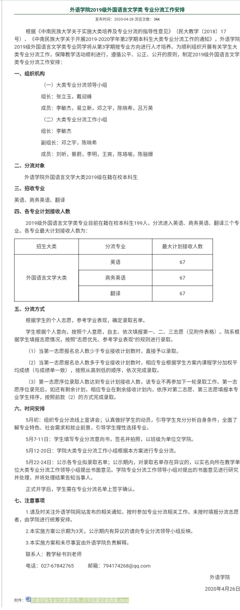 为推进我院专业分流工作顺利进行,5月6日下午,外国语言文学类专业分流动员会通过企业微信顺利召开。外语学院副院长李敏杰,英语系、翻译系及商务英语系主任、副主任和教师代表,教学秘书及2019级辅导员出席本次会议。外国语言文学类专业全体同学参加此次线上会议。陈骊姗担任本次会议主持人。