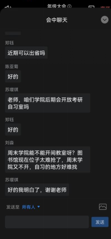 在本次会议中,陈老师主要强调四个内容。第一,安全问题。陈老师提醒同学们按照防疫要求,规范佩戴口罩,配合学校核酸筛查工作的开展,合理安排时间进行核酸检测,并提醒同学们也要注意防范春季传染病。第二,陈老师强调同学们要遵守校纪校规,服从学校疫情管控工作安排,非特殊情况不出校。第三,她还着重强调学生要预防电信诈骗,指出“害人之心不可有,但防人之心也不可无”,提醒同学们增强防电信诈骗意识,通过下载“国家反诈中心”APP,防范被诈骗,如遇到诈骗时第一时间上报学院,向辅导员和班导师寻求帮助。第四,学业规划问题。陈老师强调,现阶段是我们大学生涯的关键节点,要做好学业规划,利用身边的资源,为自己的人生发展“助力”。如有需要可与学院取得联系,进行沟通交流。最后陈老师也对同学们提出的关于学校后期是否开放考研自习室、核酸检测等问题进行了一一解答。