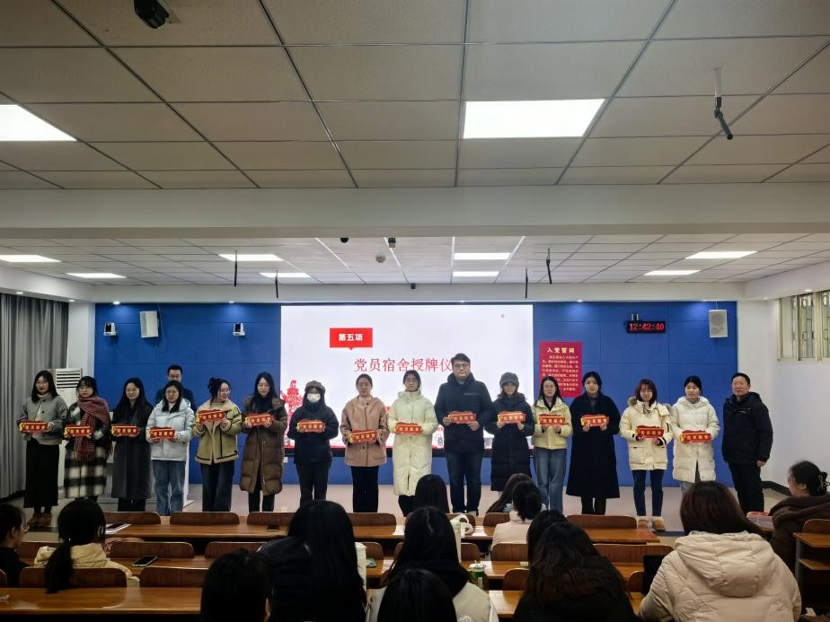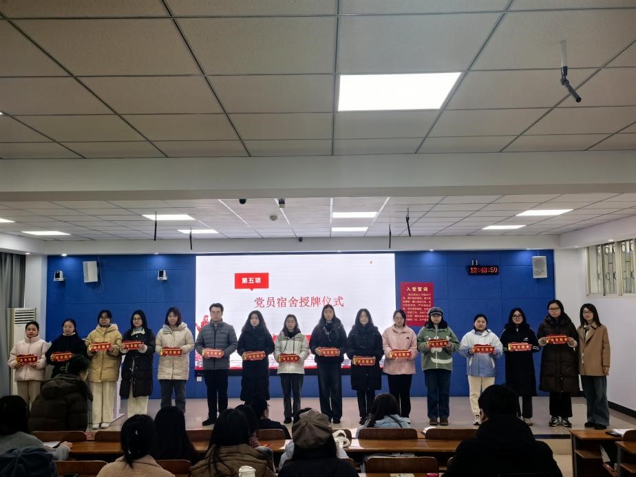 仪式在庄严的《中华人民共和国国歌》声中拉开序幕,全体与会成员起立奏唱国歌。随后,姬扬宣读了党委审核通过的新一批预备党员名单,正式欢迎33名新发展党员加入党的队伍。预备党员代表孙宇涵发言,号召全体新党员以党员标准严格要求自己,发挥先锋作用,带动身边同学共同成长进步。王斌组织全体参会的新老党员在党旗下重温了入党誓词。宣誓仪式结束后,进行党员宿舍授牌仪式,李春雷和姬扬为新党员宿舍颁发“党员宿舍”标识牌。