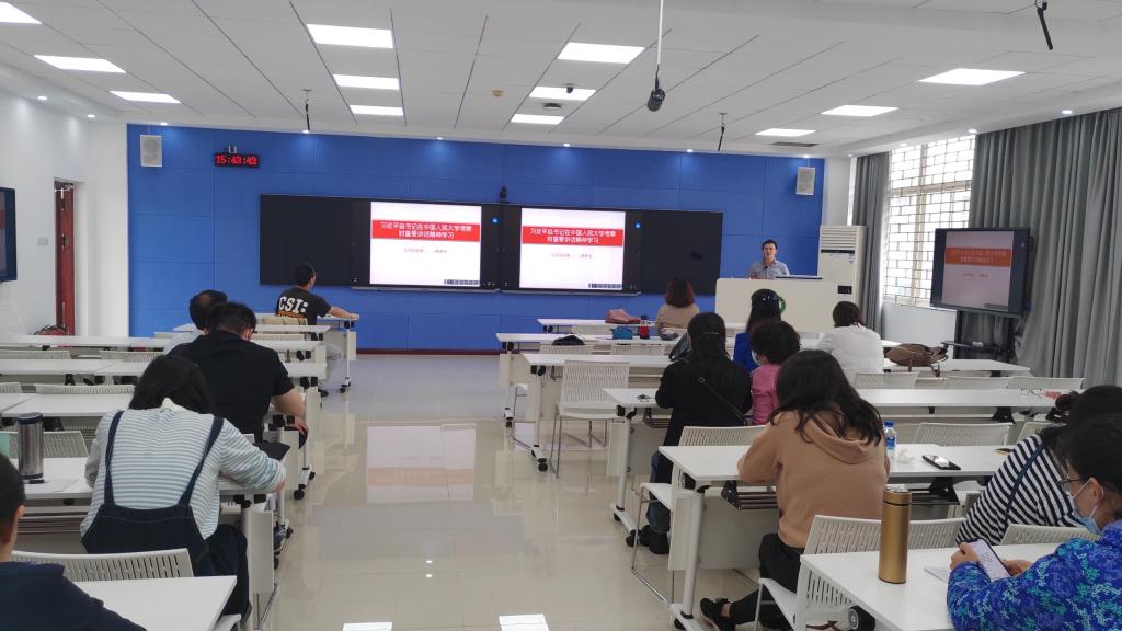 大英一室主任李春能老师领学“习近平总书记在中国人民大学考察时重要讲话精神”,全体教师结合大学英语教学和课题研究申报展开融合式讨论,表示要把总书记的教诲和嘱托转化为推动学习、促进工作的强大动力,争做新时代“经师”和“人师”统一者。