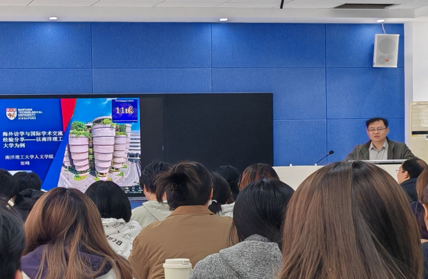 3 月 19 日下午,新加坡南洋理工大学中文系高级讲师(副高级)、博士生导师崔峰应邀前来我院,为师生开展海外访学与国际学术交流经验分享,活动由我院学生工作办公室副主任王斌老师主持,学院师生代表80余人参加。