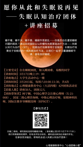 以下讲座及团体的参与方式:扫描二维码,填写报名信息和睡眠问卷。(报名截止至3月15日下午17:00)