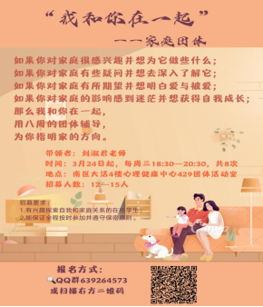 如果你对家庭很感兴趣并想为它做些什么;如果你对家庭有些疑问并想去深入了解它;如果你对家庭有所期望并想明白爱与被爱;如果你对家庭给自己的影响感到迷茫并想获得更好的自我成长;那么我和你在一起,为期八周的团体辅导,为你指明家的方向。