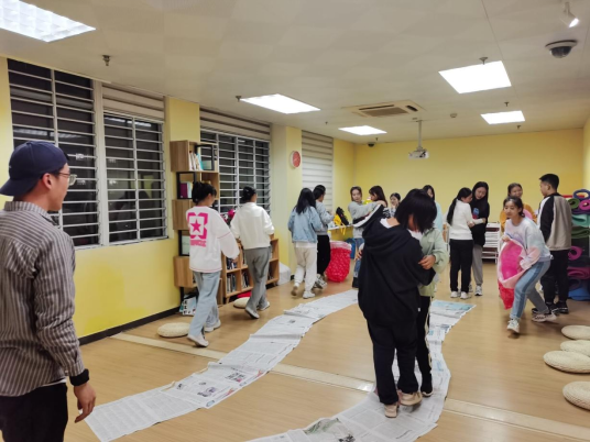 团结协作,并肩作战。同学们分为两组,在曲折的报纸路上带着气球相互配合着向前行走,在积极活跃的气氛中关系进一步加深。