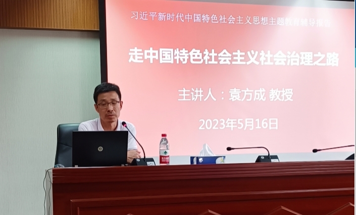 为深入学习贯彻习近平新时代中国特色社会主义思想,推动图书馆主题教育走深走实,5月16日上午,图书馆在北书院举行主题教育读书班专题辅导报告会暨党总支理论学习中心组(扩大)专题学习会。华中师范大学政治与国际关系学院博士生导师袁方成教授应邀来校,以《走中国特色社会主义社会治理之路》为题作辅导报告。学习会由图书馆党总支书记、馆长饶映雪主持,图书馆全体工作人员参加学习。