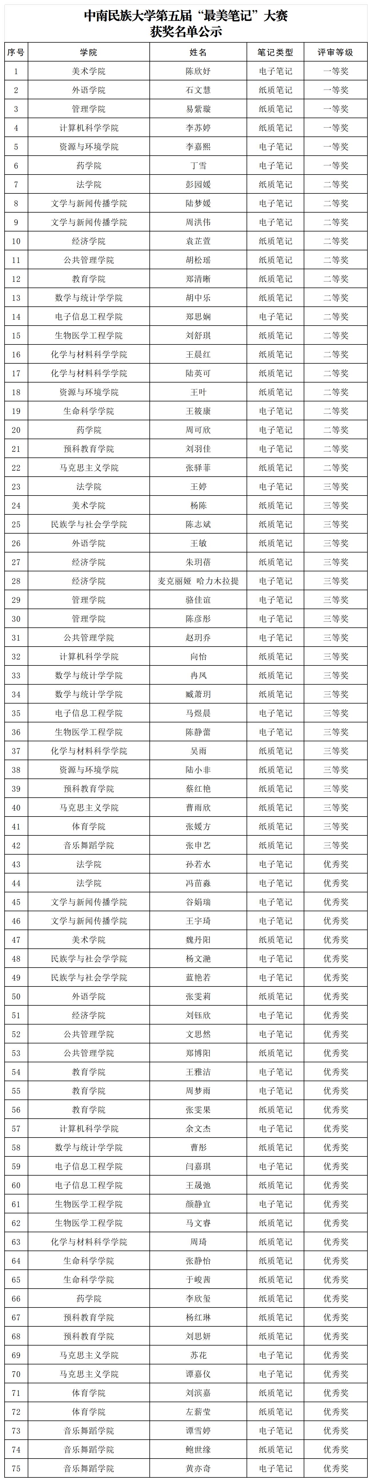根据《关于举办必赢国际437官网第五届“最美笔记”大赛的通知》,经学生申报、学院推荐、学校评审等环节,最终确定获奖学生75人。其中一等奖6人、二等奖16人、三等奖20人、优秀奖33人。具体名单见附件。学生对评选结果有异议的,可在公示期间向学校提出申诉。