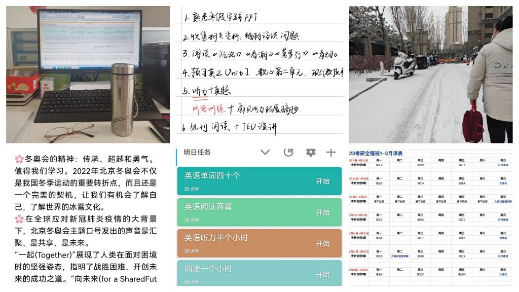 活动期间,即使是严寒的冬天,“小伙伴”们也坚持早起,进行了丰富多彩的有益身心的活动,用背单词、遛狗、早起一杯热水、健身房锻炼等不同方式来开启美好的一天。同时,在早睡打卡部分中,“小伙伴”们也用心记录了自己一天的收获并制定了第二天的学习计划,内容包含了对自己的鼓励与未来的期待。