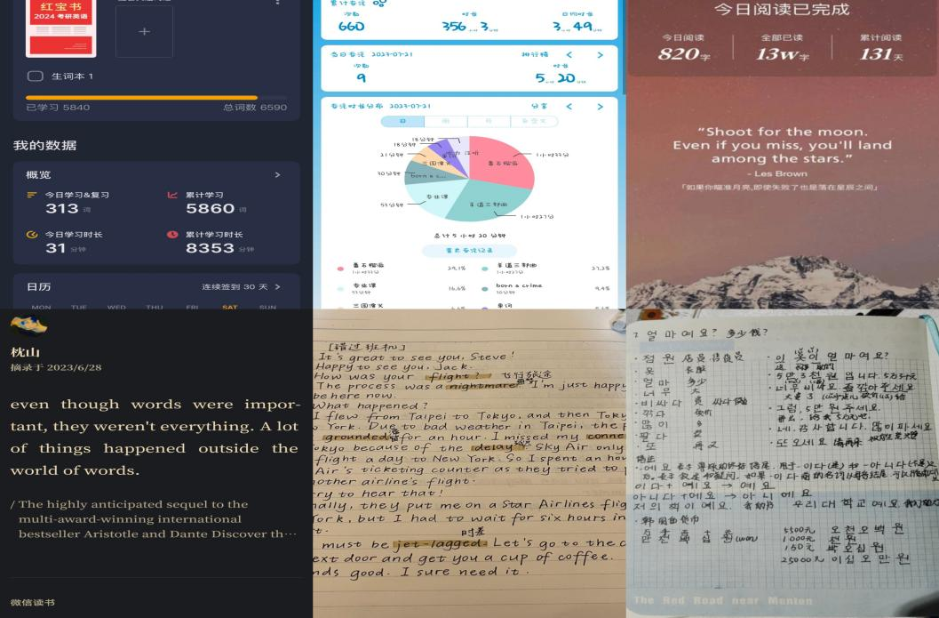 外语计划包括但不限于英语,打卡内容围绕听说读写开展活动期间,小伙伴们通过各式各样的学习方法进行打卡,内容包括背单词、学语法、练口语等,展开了对英语、日语等各类外语的学习。据统计,共有258人参与了外语计划,共打卡5389人均日学习时长达30分钟,人均日新学单词50个。小伙伴们每天按时打卡,不缺席,不懈怠,不放弃,以积极进取的姿态自主学习,不仅提高了自己的外语水平,从学习一门语言到学精一门语言,还丰富了暑假生活,在日积月累的打卡学习不断成长。