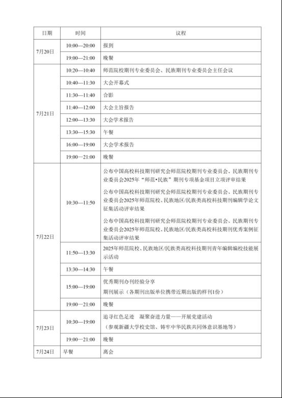 为深入学习贯彻习近平新时代中国特色社会主义思想,以及《关于深化改革 培育世界一流科技期刊的意见》《关于推动学术期刊繁荣发展的意见》等重要文件精神,探索我国师范院校、民族地区/民族类高校科技期刊的发展策略,进一步发挥师范院校、民族地区/民族类高校科技期刊在经济建设和社会发展中的作用,加强科技期刊的自身建设,不断提升办刊质量和核心竞争力,中国高校科技期刊研究会师范院校期刊专业委员会和民族期刊专业委员会定于2025年7月20—24日在新疆乌鲁木齐市联合召开“中国高校科技期刊研究会师范院校期刊专业委员会、民族期刊专业委员会2025年学术年会”。同期还将开展2025年“师范·民族”期刊专项基金项目申报、编辑学论文征集活动、科技期刊优秀案例征集活动、青年编辑编校技能展示活动,并组织党建活动。欢迎各相关单位积极参加。现将有关事宜通知如下。