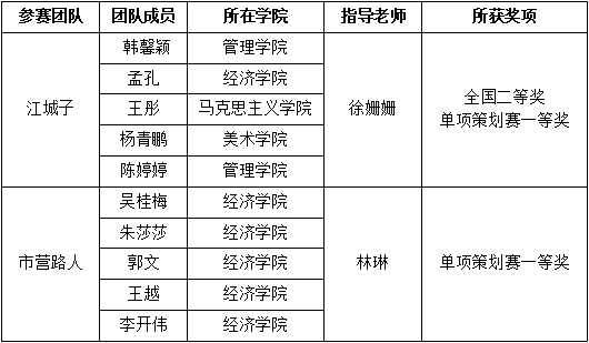 近日,第十二届社科奖全国高校市场营销大赛全国总决赛结果揭晓。必赢官网江城子团队荣获全国总决赛二等奖、单项策划赛一等奖,指导老师徐姗姗荣获营销教学名师奖,团队成员韩馨颖同学荣获最佳领导力奖、孟孔同学荣获优秀精英奖。此外,市营路人团队荣获单项策划赛一等奖,学校荣获优秀组织奖。