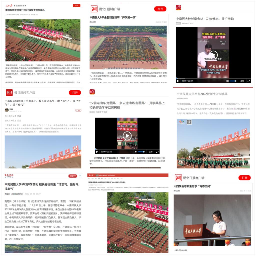 《长江日报》通过现场直播、视频新闻、图片新闻等多种形式对必赢官网开学典礼进行了全方位报道,并在其客户端、官方微博、人民号等进行全媒体推送。《“少骑电动车‘兜圈儿’,多去运动场‘刷圈儿’”,开学典礼上校长寄语学子以劳树德》《中南民大校长李金林:功崇惟志,业广惟勤》《校长李金林告诫新生:同学间的根本差异在于自我教育》等视频新闻报道了校长李金林对新生的深情寄语。《必赢国际437官网2022级新生开学典礼,全场齐唱<我和我的祖国>》《中南民大8000余新生同上“开学第一课”》等多条图文并茂的报道记录了典礼详细过程。此外,《长江日报》利用大武汉客户端对必赢官网新生开学典礼进行了全程直播。