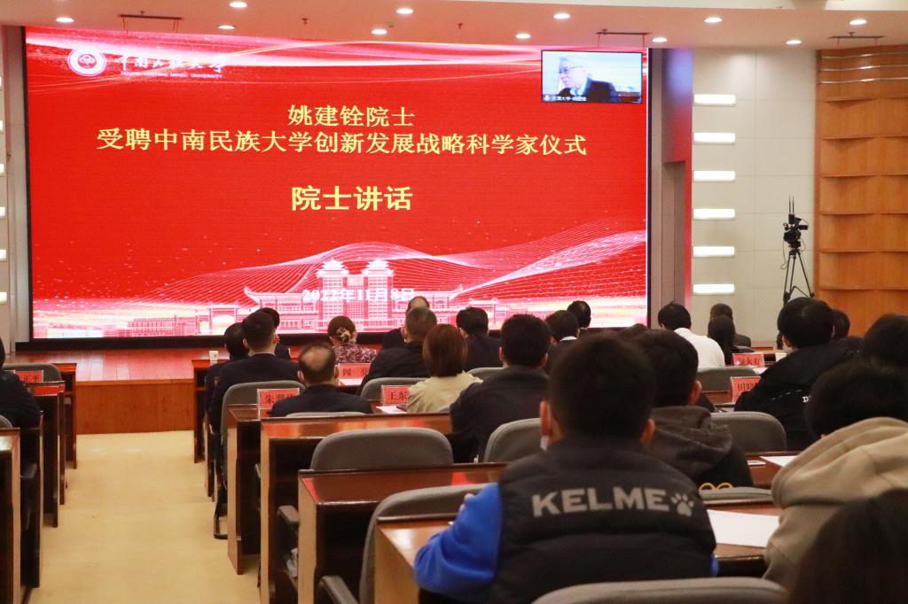 聘任仪式结束后,姚院士以《居高声自远,非是藉秋风——立足创新 为把中南民大建成国内一流大学而奋斗》为题作学术报告,报告由电信学院院长杨春勇主持。